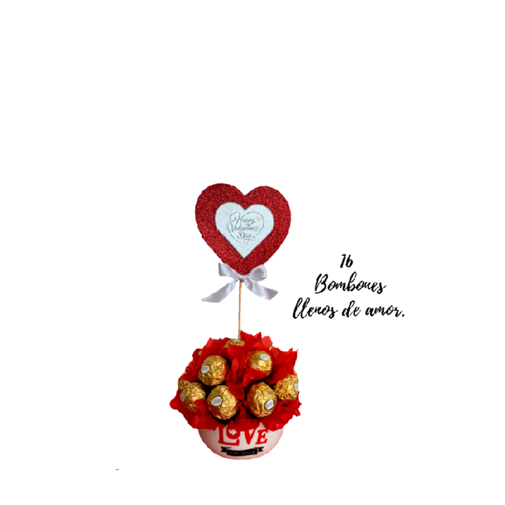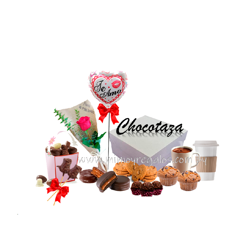 CAJITA CONTENEDORA 1 globo 1 Rosa 1 Taza de cerámica Vaso térmico con chocolatada 2 Magdalena con chispas de chocolate 4 Alfajor de chocolate Paquetito de galletitas con chispas de chocolate 2 Rosas de chocolate 12 bombones 3 brigadeiros