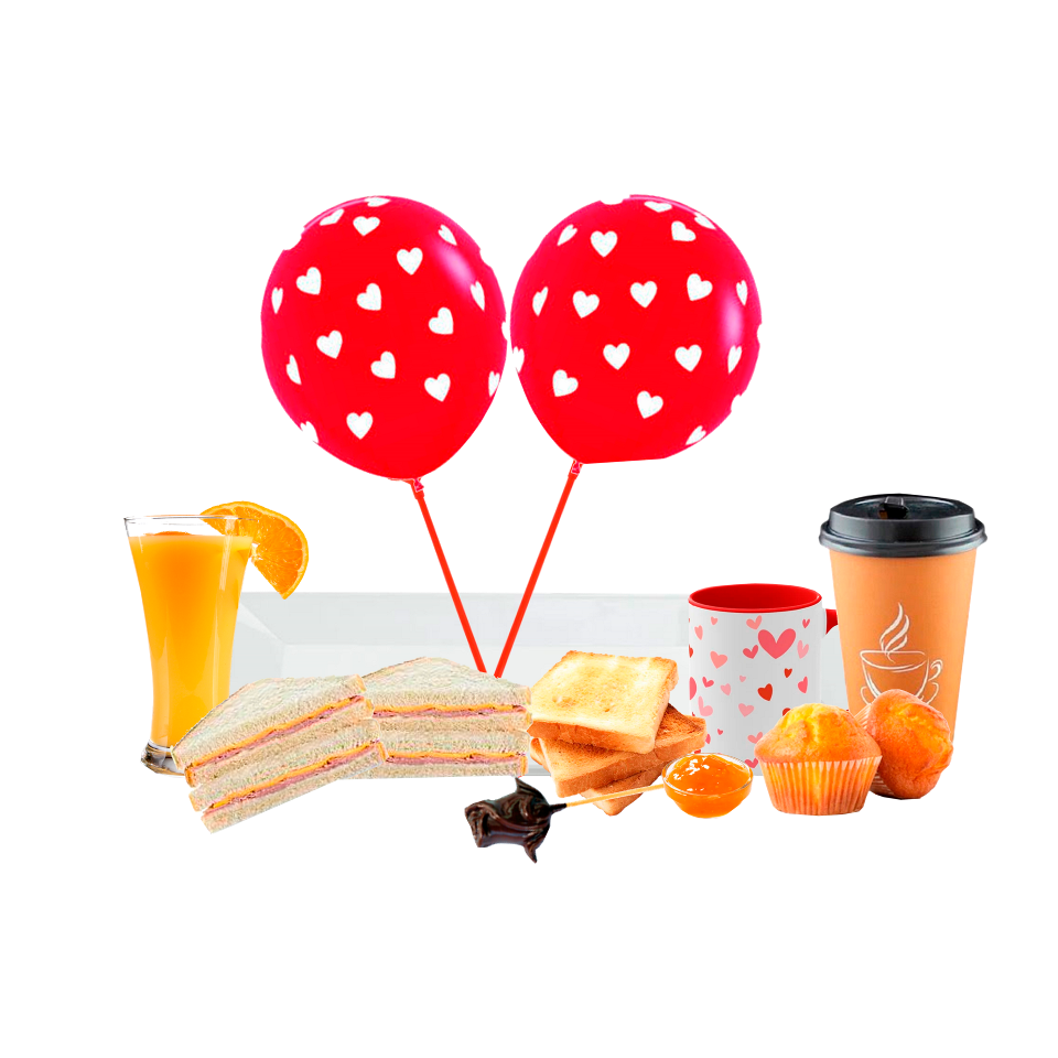 Bandejita de Melamina, 2 Globos de látex, Servilletas de Colores, 1 Taza de cerámica 1 Vaso térmico con café, 2 Tostadas + mermeladita, 1 Mixto de jamón y queso, 1 vaso de vidrio con jugo de durazno, 2 Magdalenas, 1 Rosa de chocolate.