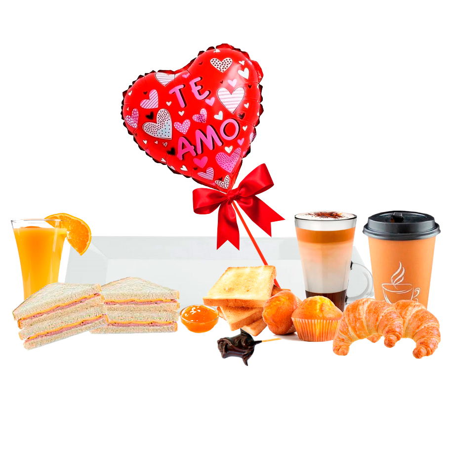 Bandeja de Melamina, 1 Globo Servilletas de Colores, Cubiertos descartables, 1 Vaso de cappuccino Vaso térmico con cappuccino 2 magdalenas 2 Tostaditas + 1 Mermeladita 2 Medialunas 1 Mixto de Jamón y Queso 1 Jugo en vaso de vidrio con jugo de durazno, 1 rosa de chocolate.
