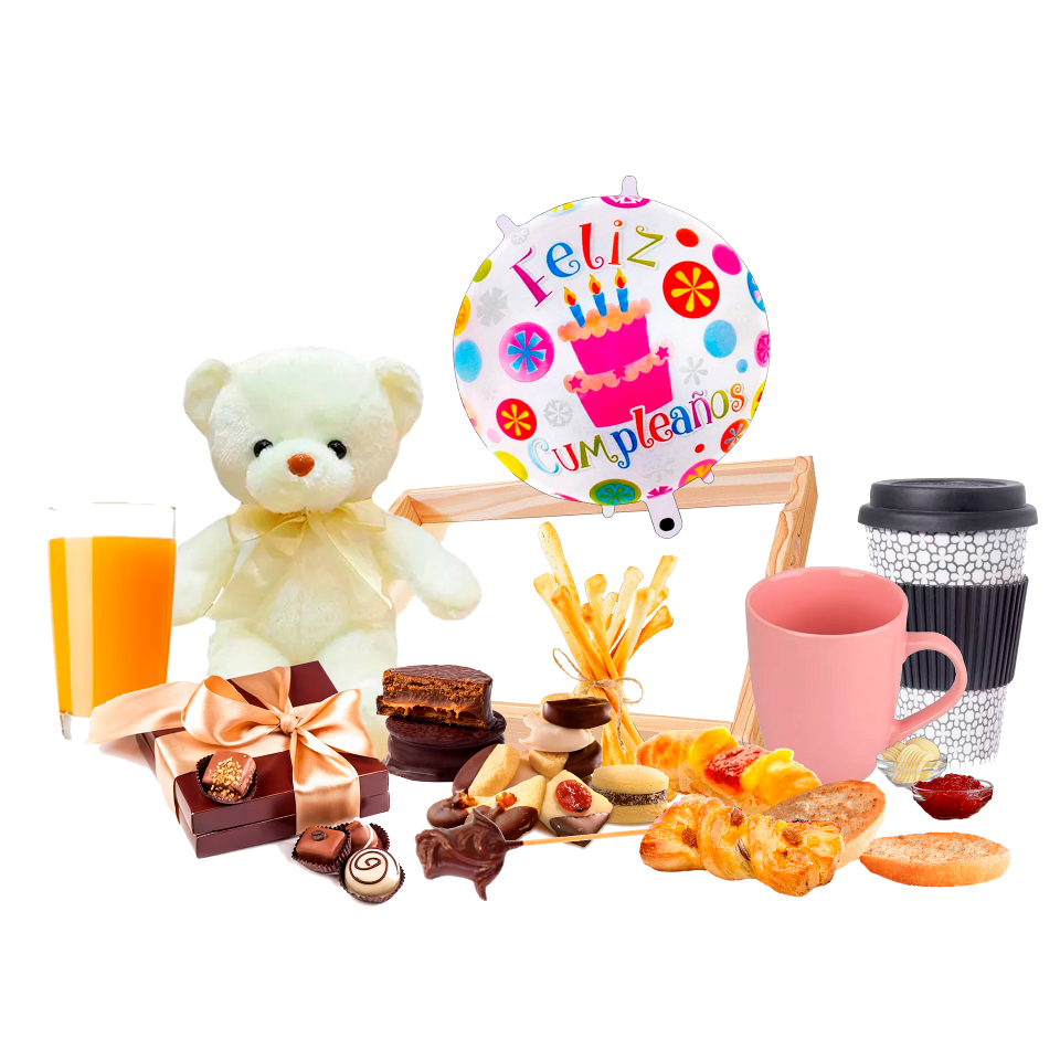 1 Peluche mediano Leche calentita 1 Tazita (servilleta de colores y cubiertos descartables) 1 Estuche de 12 bombones artesanales, Variedades de tés (cappuccino, café, matecocido ) 1 Bandejita de masitas dulces, 2 tostadas, 1 Paq. De Vainillas, 1 Mermelada x 20 gr., 1 vaso de vidrio con jugo de durazno 1 Pote de Duraznos en rodajas, 1 barra de chocolate, 2 Magdalena, 1 Alfajor.