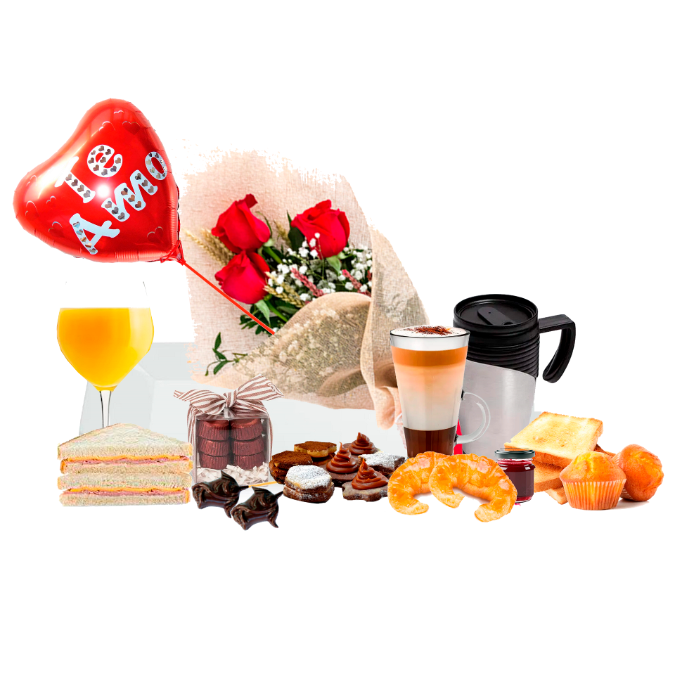 Bandeja de Melamina 1 Globo y 3 Rosas naturales 1 Estuche de 8 Bombones artesanales, 2 Rosas de chocolate, 1 Mug conteniendo un delicioso cappuccino 1 Taza de cappuccino Cubiertos descartables transparente, 2 Servilletas de colores a tono con el arreglo 2 Sobrecitos de Azúcar , 2 sobre de edulcorante, 2 tostaditas + mermelada 1 Bandejita de masitas dulces, 2 Magdalenas, 2 Medialunas 1 Sandwich de jamón y queso, 1 Jugo Natural en Copa de vidrio.