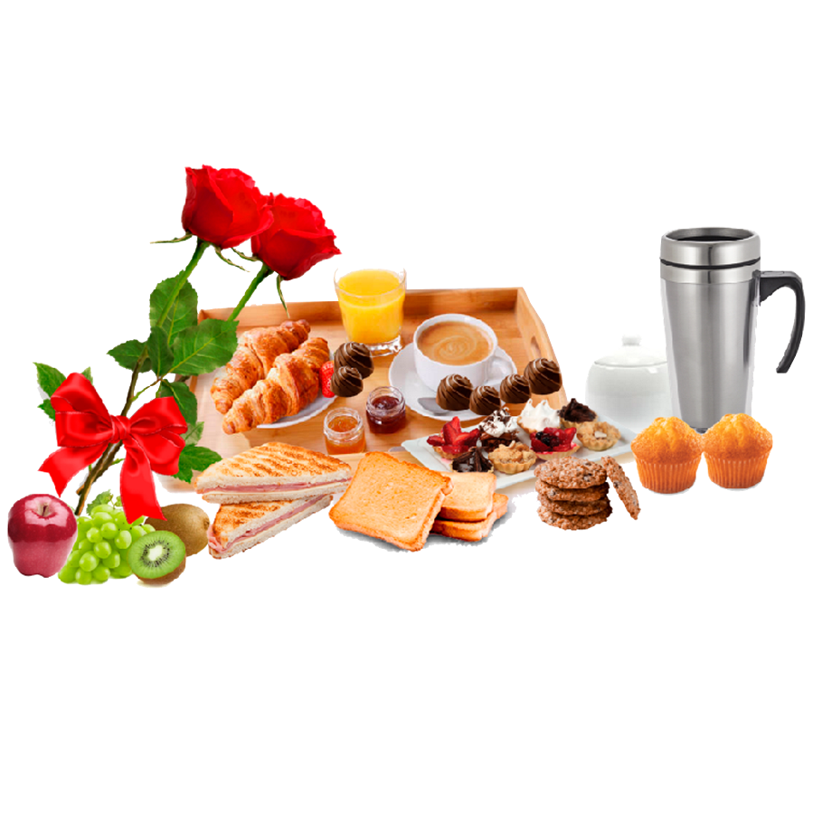 2 Rosas Naturales 1 Bandeja de MADERA 1 Vaso térmico con café con leche 1 azucarera 1 taza con platito Estuche de 6 bombones Delicatesen... 1 Mixto 2 Tostadas + 2 frasco de mermelada 2 Magdalenas 2 Medialunas 1 Bandejita de masitas Sobre de Galletitas de avena 1 Manzana + 1 kiwi + uvas