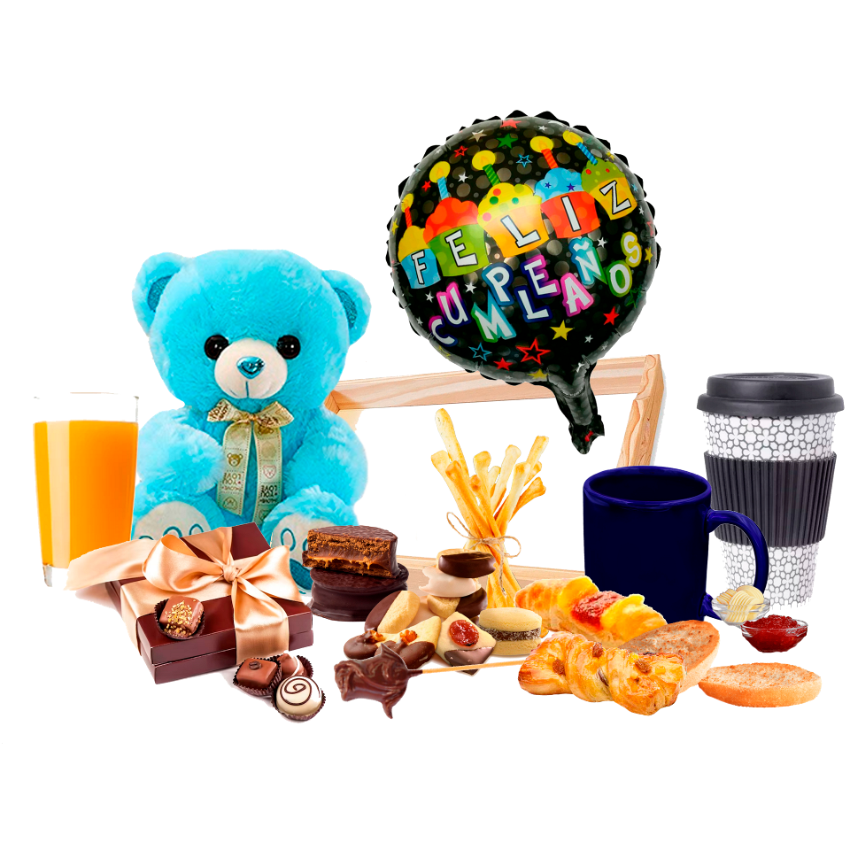 1 Peluche mediano + 1 globo Leche calentita, 1 Taza (servilleta de colores y cubiertos descartables), 1 Estuche de 12 bombones artesanales, 1 Bandejita de masitas dulces, 3 tostadas, 1 Paq. De Vainillas, 1 Mermelada x 20 gr., 1 vaso de vidrio con jugo natural de durazno 1 Pote de Duraznos en rodajas, 1 barra de chocolate, 2 Magdalena, 1 Alfajor, 1 paquete de chipitas.