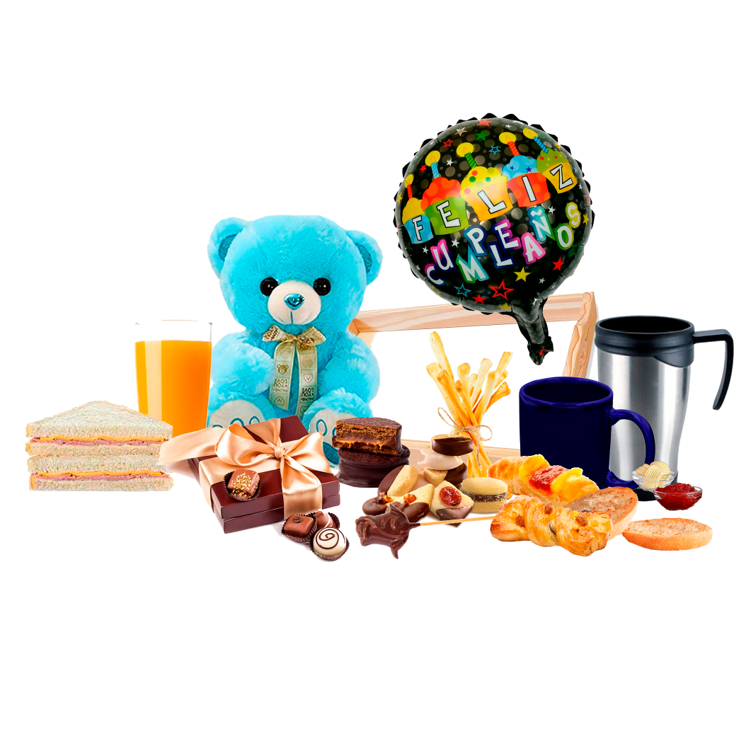 1 Peluche mediano + 1 globo 1 Mug con Leche calentita, 1 Tazita con platito (servilleta de colores y cubiertos descartables), 1 Estuche de 12 bombones artesanales, 1 Mixto de jamón y queso 1 Bandejita de masitas dulces, 3 tostadas, 1 Paq. De Vainillas, 1 Mermelada x 20 gr., 1 Dulce de leche x 20 gr. 1 vaso de vidrio con jugo Natural 1 Pote de Duraznos en rodajas, 1 barra de chocolate, 2 Magdalena, 1 Alfajor, 1 sobre de Papas fritas 1 paq. De Chipitas, 1 Paq. De confites de chocolate.