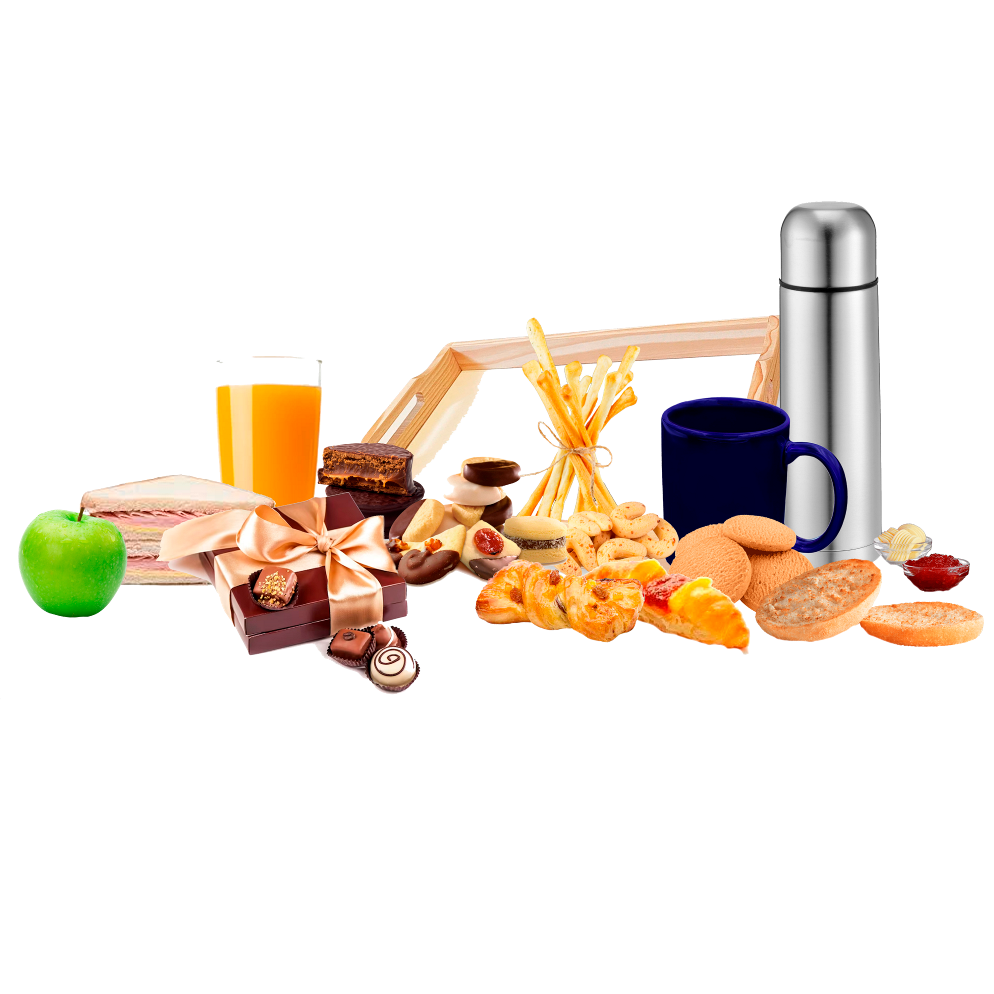 1 Termo de metal de 750cc. con leche 1 Estuche por 12 bombones 1 Taza de cerámica Cubiertos descartables transparente 2 Servilletas de colores a tono con el arreglo 1 Pote de Dulce de Leche 20 gr, 1 Pote de Mermelada 20 gr. 1 Sobre de cappuccino y Café soluble 1 alfajor 2 facturas dulces 1 Bandejita de masitas dulces 6 Galletitas dulces de vainilla 1 Paq. De Chipitas 1 Paq. De Grissines 3 Tostadas 1 Vaso de vidrio con jugo (naranja o durazno a elección) 1 Manzana verde