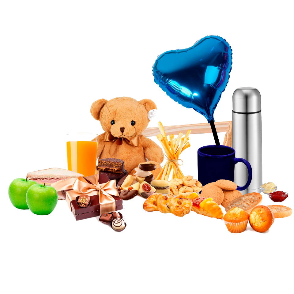 1 Peluche mediano + 1 Globo metalizado a elección 1 Estuche de 12 Bombones artesanales 1 Termo de metal de 750cc. con leche 1 Taza de cerámica Cubiertos descartables transparente, 2 Servilletas de colores a tono con el arreglo 1 Café soluble sobrecito, 1 Te de mate cocido, 1 Sobre de cappuccino 1 Pote de Mermelada, 1 alfajor 2 Magdalenas 2 Facturas dulces 3 tostadas 1 Bandejita de masitas dulces 1 Paq. De Grissines 1 Sobrecitos de chipitas 1 Sandwiche de Jamon y queso 1 vaso de Jugo 2 Manzanas verdes