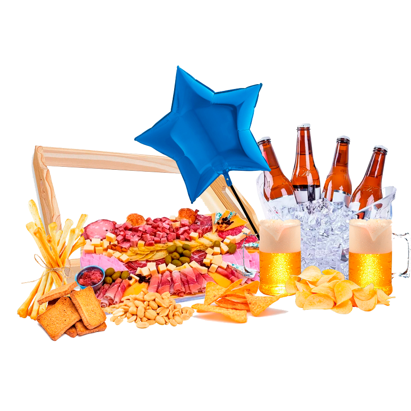 1 Bandeja de Madera 1 globo a elección 1 Hielera 4 Cervecitas 2 choperas para tu cerveza Tabla o Platón con picadas de... Quesos, fiambres, Jamones, Salames, Aceitunas, Maní salado, Papas fritas, tostadas, grissinies, doritos...