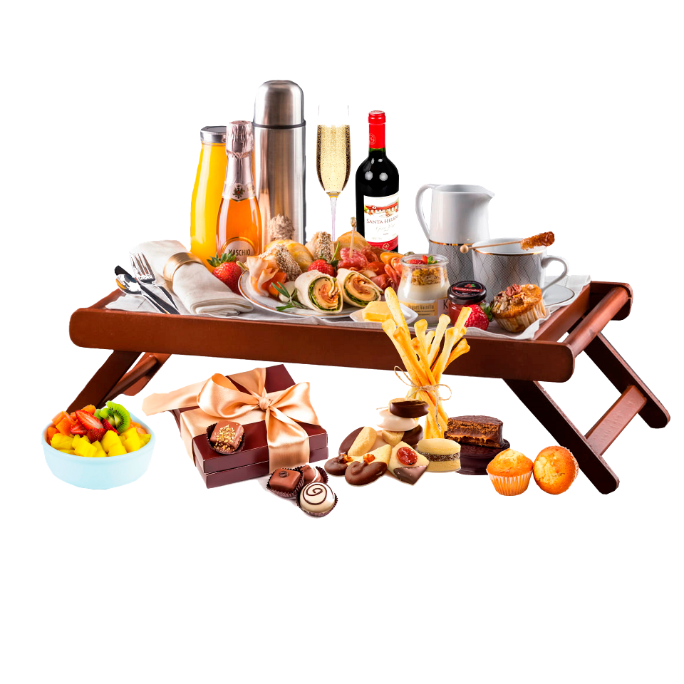 Bandeja de MADERA con patitas Estuche de 10 bombones 1 Champang 1 Termo de metal de 750cc 1 Taza con platito (servilleta de colores y cubiertos descartables) 1 Lechererita 2 magdalenas 1 Alfajor 1 Bandejita de masitas 1 Frasquito de Mermelada 1 Sándwich de verduras 1 Picadita con arrolladitos de jamón y queso 1 Paq. De grissines 1 Vino 375 cc. 1 Copa 1 Frasquito con yogurt y cereal Frutas (Uva, Manzana, Kiwi) 1 Frasco de jugo natural,