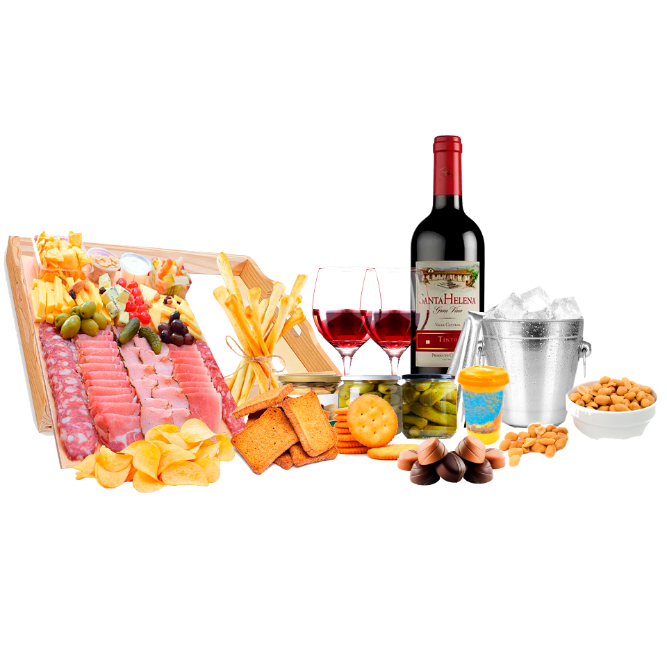 1 Bandeja de Madera 1 hielera + 1 vino tinto Santa Helena de 750 ml. 2 copas de cristal Tabla o Platón con picadas de... Quesos, fiambres, Jamones, Salames, Aceitunas, Maní salado, Papas fritas, tostadas... 10 bombones 1 frasco de pepinillo 1 frasco de champiñones 1 frasco de aceitunas 1 pote de queso fundido 1 bandejita de papas fritas 1 paq. De grissines 6 tostaditas 1 Paq. De galletitas saladas 1 frasco de maní salado
