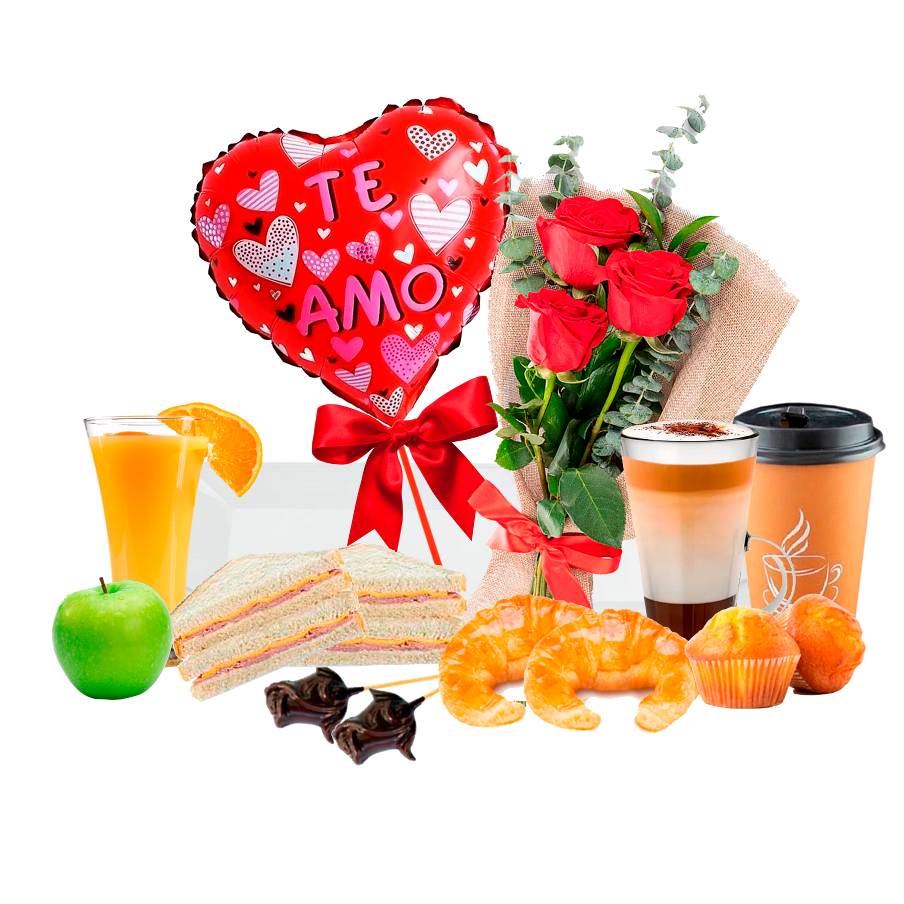 1 Bandeja de melamina, 3 Rosas Naturales en arreglo + 1 globo 2 rosa de chocolate 1 Taza café con Leche 1 vaso de vidrio con jugo natural de Durazno, 2 Magdalena 2 Medialunas, 1 Manzana verde 1 Sandwich de Jamón y Queso,